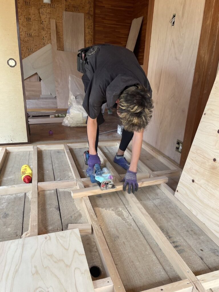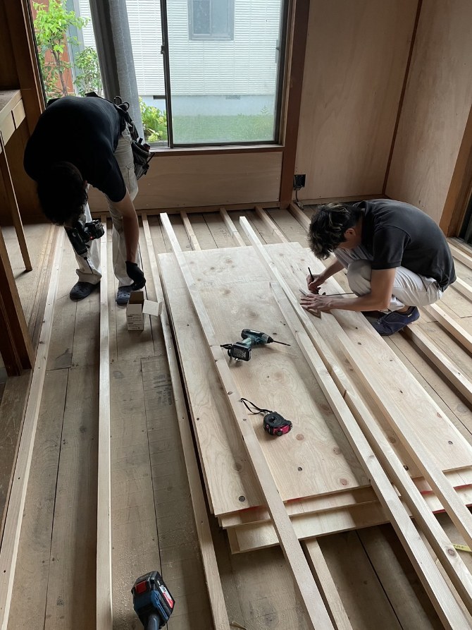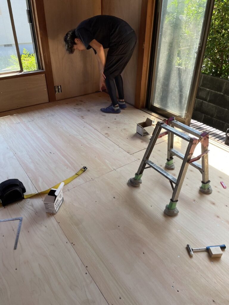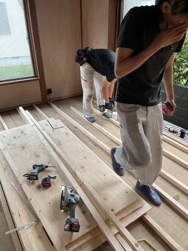 根太を作って合板貼後、フロアータイルで仕上げ。床も明るめの色にしました。