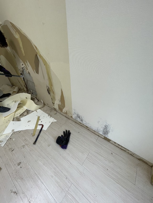 既存クロスを剥がしたところ、中のボードが崩れおちてくる現状。