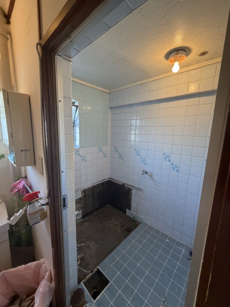 工事初日。浴槽、浴室扉撤去。壁がタイル仕様です。天井はちょっと写ってませんね・・・塗装天井でした。