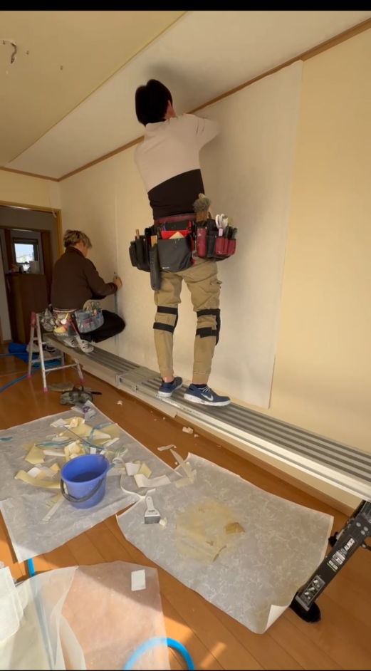 9時スタート、まずはクロスの剥がし。クロスの作業は長男君、次男君の担当。