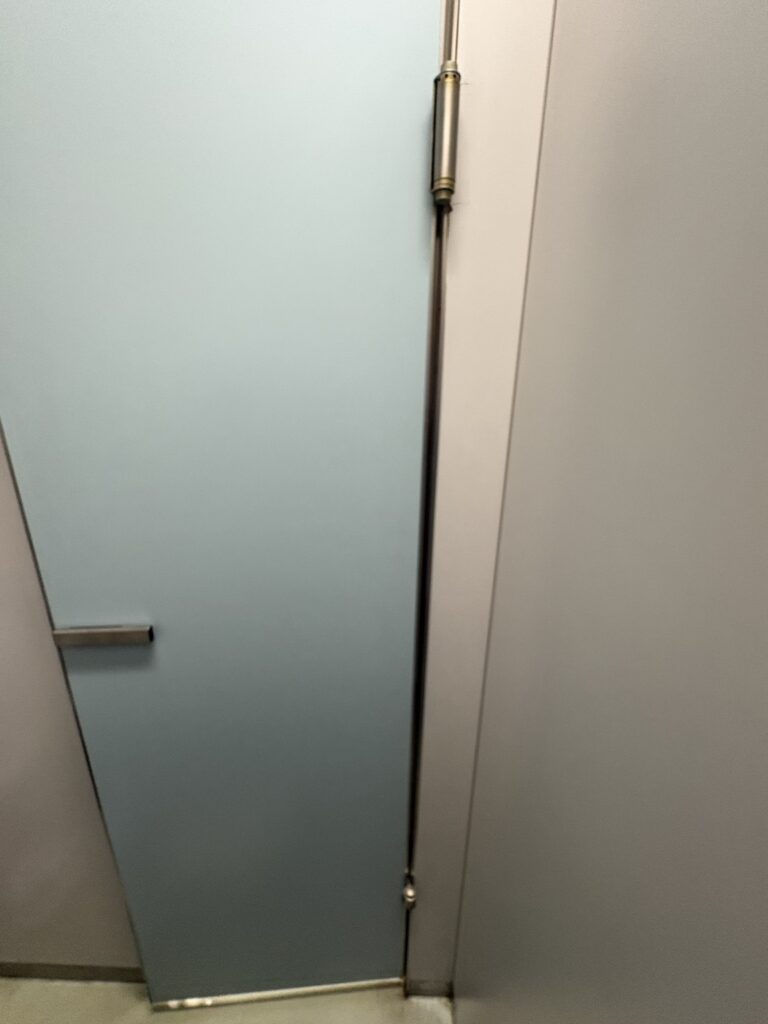 この程はだ男子トイレの扉枠の歪みからドア開閉に不具合による補修工事となります。