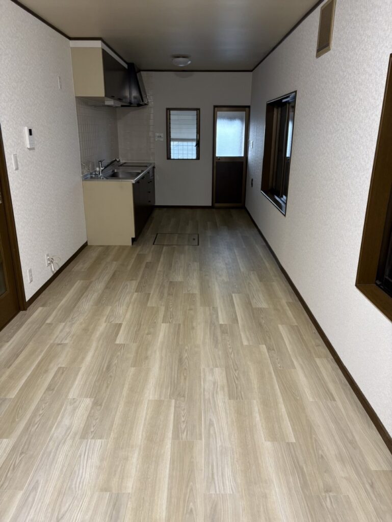 戸建てなんですが、ここは賃貸になります。オーナー様自身で修復工事をされたそうですが、玄関入ってすぐのお部屋の床にフロアータイルを貼りたいとのご希望でこの程ご依頼を賜りました。
